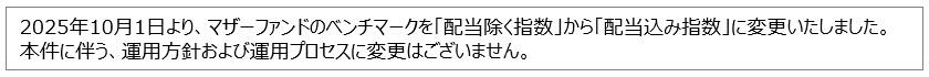 投資信託へのご投資を検討される場合には、必ず投資信託説明書(交付目論見書)をご覧ください。また、ファンドの取得のお申込みを行う場合には投資信託説明書(交付目論見書)をあらかじめ、または同時に販売会社よりお渡しいたしますので、必ず投資信託説明書(交付目論見書)で内容をご確認の上、ご自身でご判断ください。