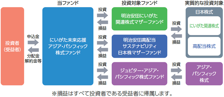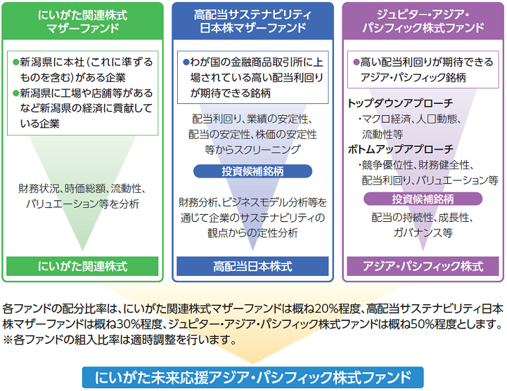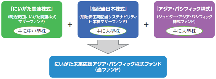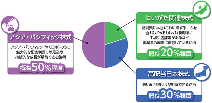 当ファンドは、「にいがた関連株式」、「高配当日本株式」、「アジア・パシフィック株式」を組み合わせて運用を行います。