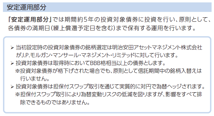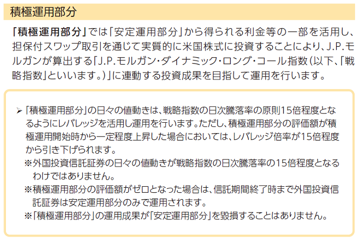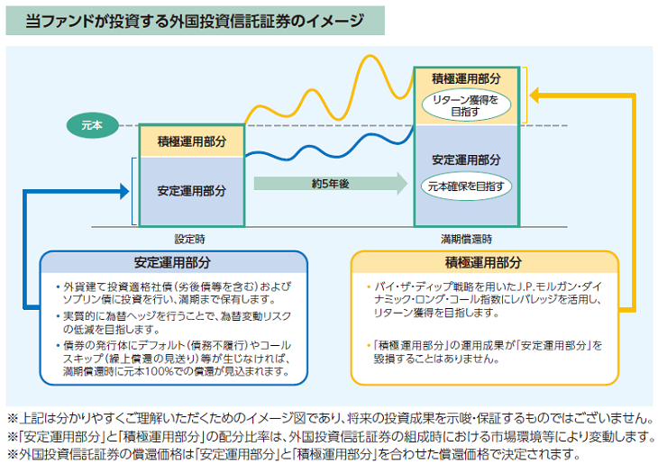 外国投資信託証券は「安定運用部分」と「積極運用部分」で構成されます。 当該ファンドの償還日において「安定運用部分」で元本の確保を目指すと同時に、「積極運用部分」で高いリターンを目指します。