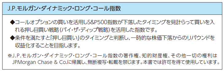 - 当ファンドがスワップ取引を通じてリターンを受取るJ.P.モルガン・ダイナミック・ロング・コール指数の価格は指数管理費用(年率0.25%)および取引費用等が控除されます。なお、取引費用等は市場環境に応じて変動するため、 事前に料率上限等を表示することはできません。