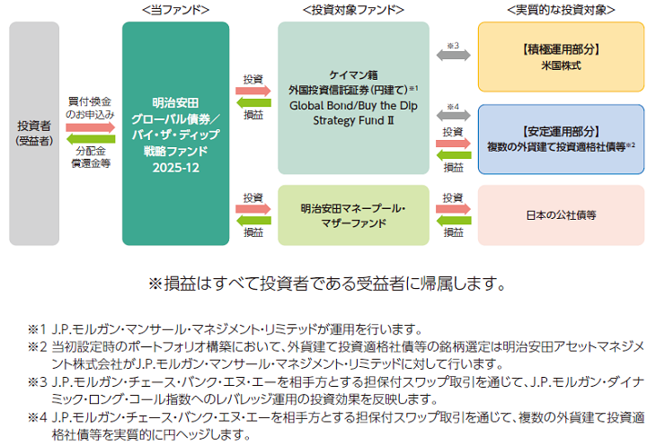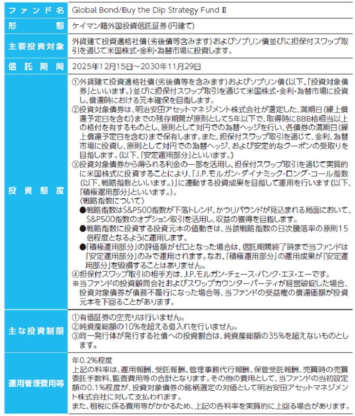 J.P.モルガン・ダイナミック・ロング・コール指数(以下「戦略指数」といいます。)は、明治安田アセットマネジメント株式会社(以下「明治安田AM」といいます。)の利益のためにJPモルガン・セキュリティーズ・ピー・エル・シー(以下「JPMS plc」といいます。)によりライセンスされています。JPMS plcおよびその関連会社(総称して、以下「JPモルガン」といいます。)は、明治安田AMおよび明治安田グローバル債券/バイ・ザ・ディップ戦略ファンド2025-12(以下「本商品」といいます。)に関するスポンサー、運営、支持、販売または推奨を行っていません。JPモルガンは、本商品に投資する投資家や、保有者それ以外の方法で本商品にエクスポージャーを取る者(総称して、以下「投資家等」といいます。)に対し、明示または黙示を問わず、いかなる点の表明保証を行いません。投資家等は、独自に適切な専門家の助言を求めたうえで本商品への加入等の判断を行ってください。戦略指数は、ライセンシー、本商品または投資家等に関わりなく、JPMS plcにおいて独自に設計、編纂、計算若しくは維持され、またはそのスポンサーを担われているものですが、同社は、かかる行為を継続する義務を負いません。JPモルガンは、戦略指数および本商品と類似し、又は競合する可能性のある他の指数や商品を独自に発行し、またはそのスポンサーとなることがあります。JPモルガンは、戦略指数の参照資産または当該参照資産を参照するデリバティブ取引等の金融商品についての取引を行うことがあります。上記のいずれかの行為により、戦略指数および本商品の価値に対し、何らかの影響を与える可能性があります。
